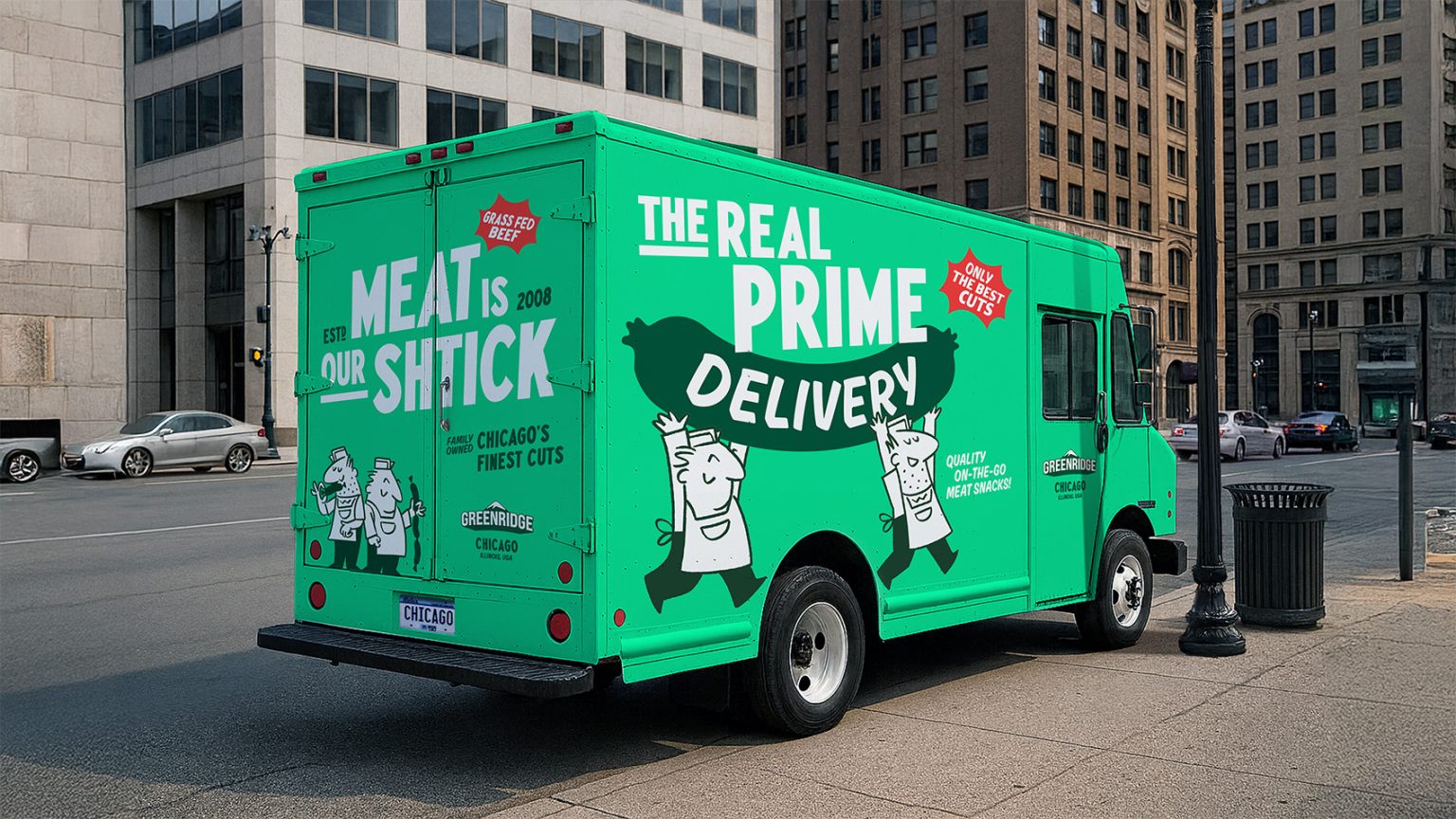 Around them, we built a world alive with Chicago’s deli culture. From a palette of grass-fed green and cured red to bold butcher’s-block typography, the identity reflects the care behind every ingredient. An unmistakable brand with cut-through character across sticks, packs, and trucks.